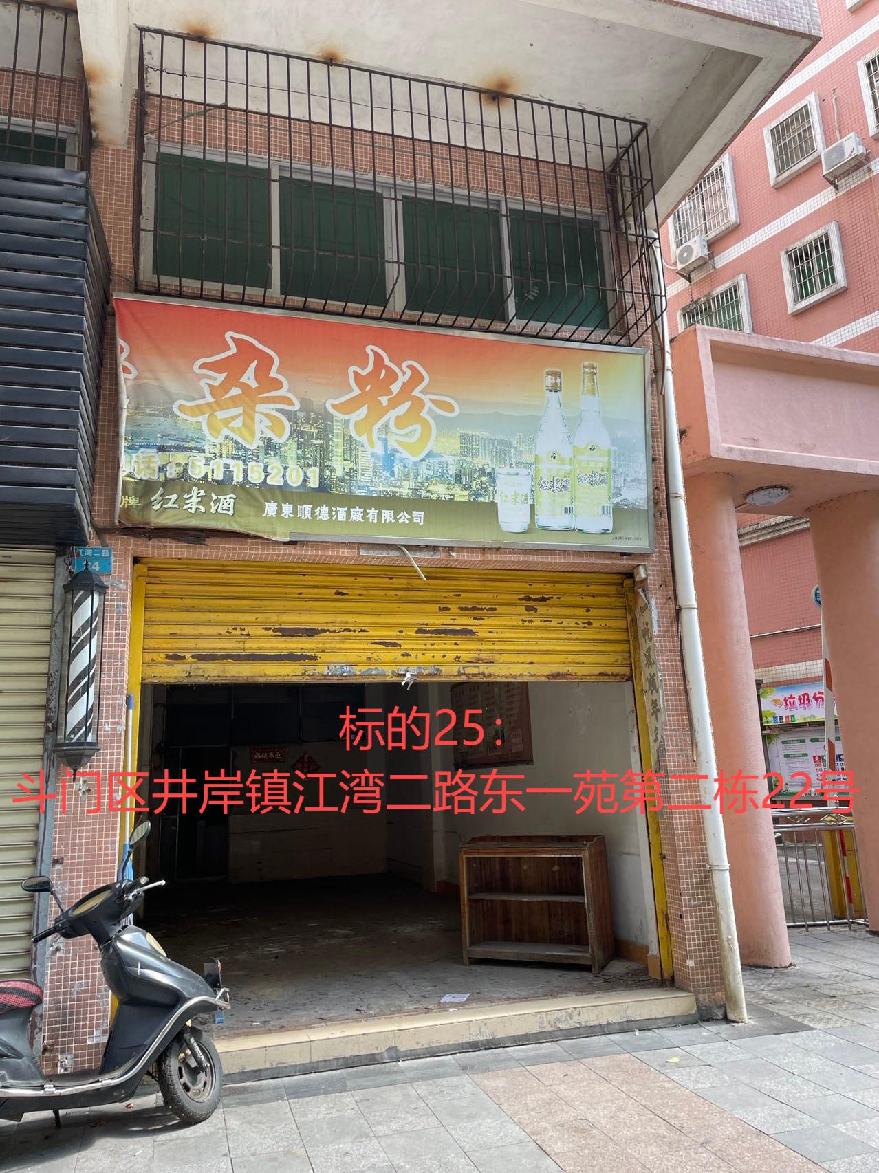 25、珠海市斗门区井岸镇旭日街17号,面积约32平方米,按现状整体出租,租赁期限5年,招租底价每月租金2560元,第二年起每年的租金在上年度租金基数的基础上递增5%,需交竞价保证金2560元,竞拍幅度每次50元。